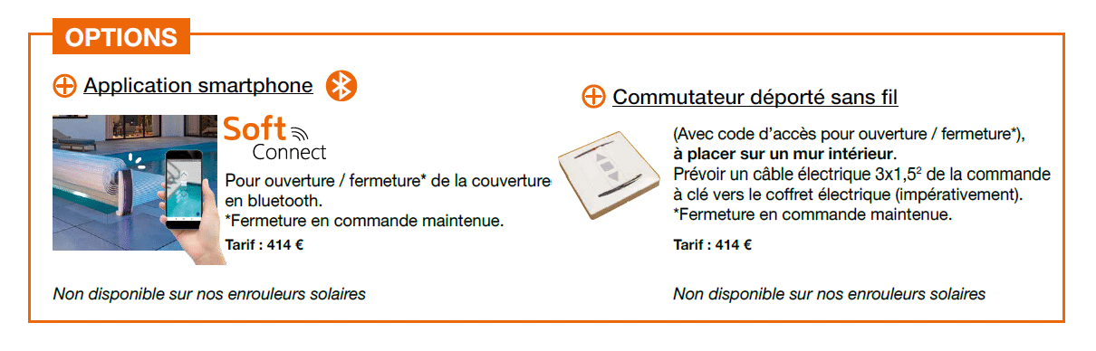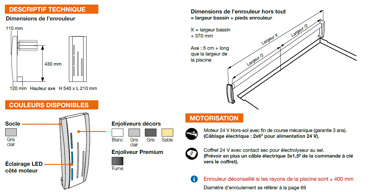 côté moteur + Moteur 24 V avec fin de course mécanique + Coffret 24 V électrique avec contact sec pour électrolyseur au sel + Couverture en
