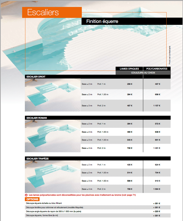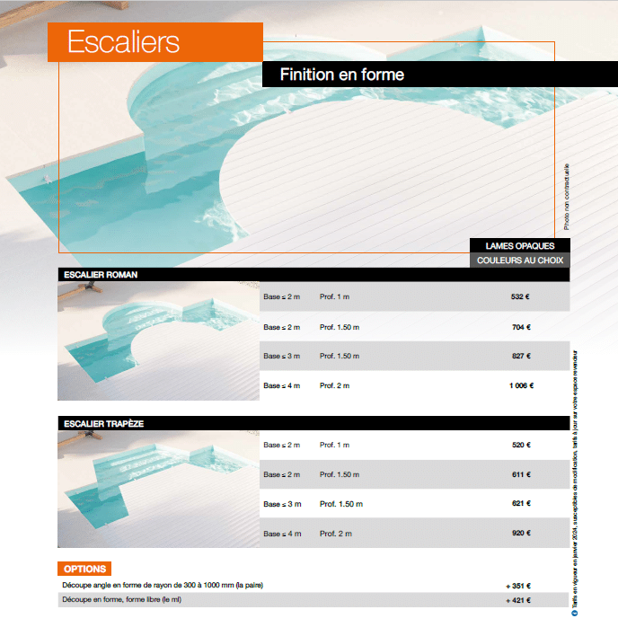 Escaliers : Finition équerre ou forme et choix escalier droit, roman ou trapèze. Prix selon le type de lame (opaque ou polycarbonate), de finition et dimension de « l’encoche » escalier (largeur, profondeur, pourcentage d’arrondi pour ajustement).